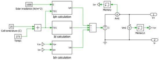 Using Equations (1)–(7), a PV module model is constructed in PLECS as shown in Figure 5.