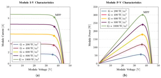 PV module characteristics with changing irradiance and constant cell temperature of 25 °C: (a) I-V curve; (b) P-V curve.