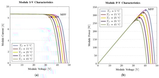 PV module characteristics with changing cell temperature and irradiance of 1000 W/m2. (a) I-V curve; (b) P-V curve.