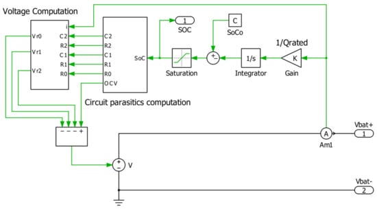 where Qrated is the rated or nominal capacity of the battery (Ah). A Thevenin model is produced in PLECS, as shown in Figure 9, consisting of two subsystems which calculate the battery capacitances and resistances for various SoC, and with these values, the battery voltage is evaluated in the next subsystem. This battery model is used for the various simulations in this work as it gives fairly accurate results.