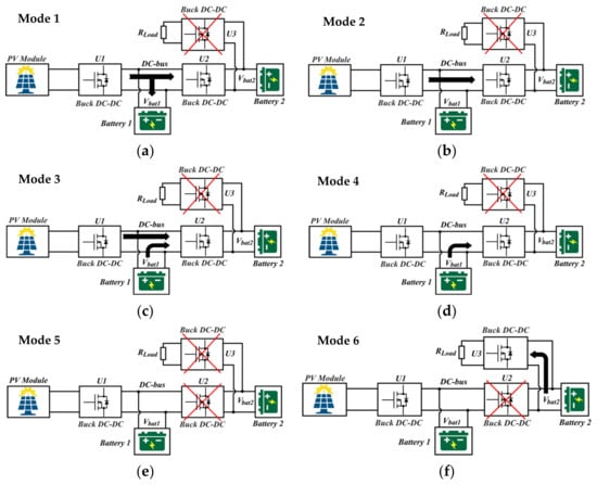 The control of power flow in the standalone system depends on the output power of the PV module, the load power demand, and the SoC of the BESS. The operation can be divided into six main modes (shown in Figure 10) which are explained below. Modes 1 to 5 correspond to periods where battery 2 is charged; consequently, converter U3 is shut down during these periods.