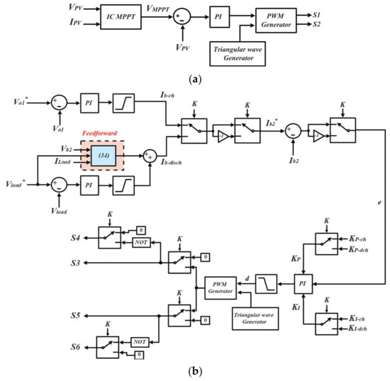 The proposed control algorithm adopted for the circuit is shown in Figure 12. Figure 12a contains the control scheme for generating the control signals for converter 1 through MPPT control, while Figure 12b shows the control scheme for the generation of the signals for converter 2 and 3. The PWM signals generated for converter 2 and 3 comprise two different control paths. During the first phase, battery 2 charging voltage is controlled and a PI controller for this loop generates the reference battery current for battery 2, which is then used to generate the control logic for converter 1. During this period, converter 3 is completely shut down and non-operational. However, once the discharge signal (K) has been triggered, the control path and objective change to control the output load voltage. The output load voltage is then used to generate the input reference battery current for battery 2, which is used in generating the control signals for converter 3. During the battery 2 discharge phase, converter 2 is completely shut down. Furthermore, the discharge signal K could represent the battery 2 state of charge or battery 2 voltage; however, for this work, a simple 0/1 digital logic has been utilized for the control system proof-of-concept tests. A novel feedforward algorithm has also been introduced to improve the dynamic response of the system, especially in the presence of disturbances.
