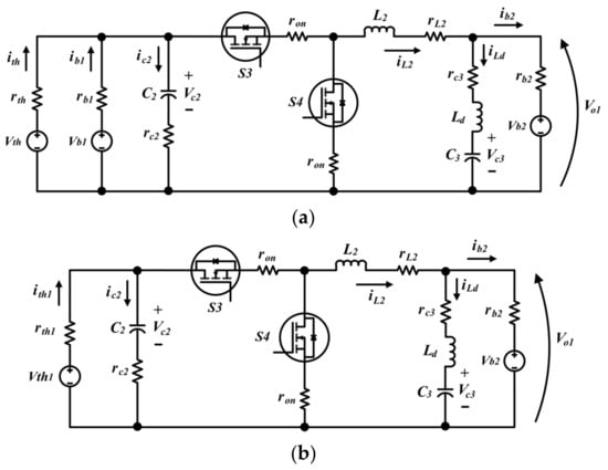 Just like the previous case, the circuit in Figure 15b is assumed to be working in CCM. As such, there are two operating modes of the circuit: S3 = ON, S4 = OFF, and S3 = OFF, S4 = ON. Also, the state variables x(t) are the two inductor currents, the input capacitor voltage and the output capacitor voltage (x(t) = {iL1(t), iLd(t) vC2(t), vC3(t)}), the input variables u(t) are the Thevenin equivalent voltage and the battery voltage (u(t) = {Vb2, Vth1}), while the output variables y(t) are the output voltage and battery current (y(t) = {Vo1(t), ib2(t)}).