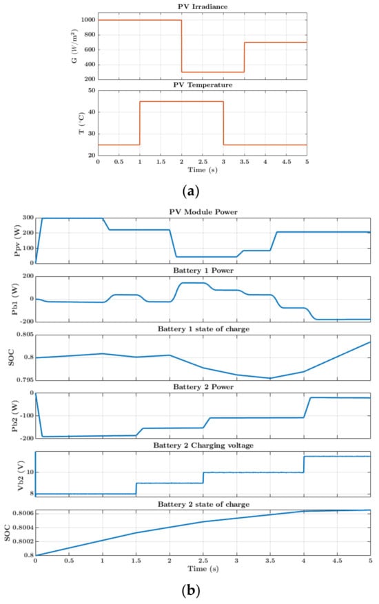 The power flow and energy management system are investigated by varying the irradiance and temperature of the PV module for 5 s as seen in Figure 18a. This variation brings about a change in the PV output power sent to the converters. During this period, battery 2 is charged at constant voltage values of 8 V, 9 V, 10 V, and 11 V. The power flow profiles obtained are shown in Figure 18b. We observe from Figure 18b that when the power demanded by battery 2 is such that it can be provided by the PV system alone, the backup energy source (battery 1) is charged, indicated by an increase in its state of charge. From Figure 18b, this process occurs during three time periods: 0–1 s, 1.5–2 s, and 3.5–5 s. On the other hand, when the demanded power from battery 2 cannot be provided solely by solar PV, then battery 1 starts to discharge to provide the additional power needed to charge battery 2. This process occurs during two intervals: 1–1.5 s and 2–3.5 s. In the battery model developed, negative power corresponds to the battery being charged and vice versa.