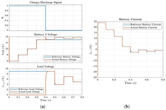 To evaluate the charge and discharge profile of battery 2, the K-signal is used, as shown in Figure 19a, where a ‘1’ stands for the charging action of the battery and a ‘0’ stands for the discharging action of the battery. We see from Figure 19a that battery 2 is charged at constant voltage values of 8, 9, 10, and 11 V for a period of 0.4 s. During this time, the control system controls both battery 2 voltage and current as observed in Figure 19b. Also, during this period, the load is not under control, showing that converter 3 is inactive. However, once battery 2 starts to discharge, the load voltage is controlled in steps of 9, 4, 7, and 5 V while simultaneously controlling the battery 2 current as observed in Figure 19b. By controlling the battery current during both charge and discharge cycles, we are improving the health of the battery, hence increasing its lifetime.