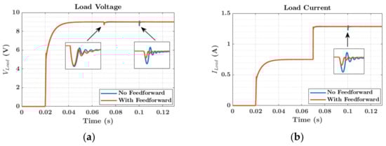 Figure 20 compares the control system with and without feedforward compensation in the presence of load and input voltage disturbances at t = 0.07 s and t = 0.1 s, respectively. When these disturbances occur, the load voltage disturbance is higher when there is no compensation and takes more time to return to the steady state voltage value of 9 V. A similar behavior is observed with the load current response. The feedforward term therefore improves the dynamic response of the system in terms of speed of response and undershoots.