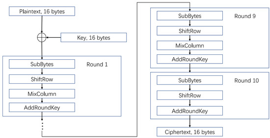 In the mid-to-late twentieth century, when computer science was developing rapidly, the security of the Data Encryption Standard (DES) was seriously threatened by the superior information processing power of computers, which led to the emergence of a new encryption standard, the Advanced Encryption Standard [16]. AES has a packet length of 128-bit and three key lengths of 128-bit, 192-bit, and 256-bit, respectively. In this paper, we focus on the AES-128 encryption algorithm. The AES encryption process requires a total of 10 rounds, and each iteration includes four operations (see Figure 1): AddRoundKey, SubByte, ShiftRows, and MixColumn, while the tenth iteration does not include the MixColumn. The SubByts operation in software implementations uses a pre-stored lookup table called SBox from the internal registers in the encryption chip for byte substitution, and loads the generated intermediate state value of the data bus. This makes the output of the SBox substitution in the first round of the AES a common attack point for adversaries.