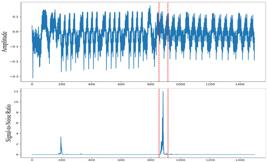 - Calculate the SNR between the power consumption trace data and the obtained intermediate value. Afterwards, select the trace segments with the highest SNR values as PoIs. Figure 2 represents the plot of a captured power trace and the SNR results of the corresponding traces.