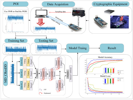 - Key recovery. In the AES-128 encryption algorithm, the key consists of 16 bytes. To recover each byte of the key, we follow a sequential approach. We derive the intermediate value state associated with the byte of the key that needs to be recovered using the trained model. Finally, we recover the target subkey from the derived intermediate value based on the known plaintext information. The complete process of the MD_CResDD based deep-learning side channel attack is illustrated in Figure 3.