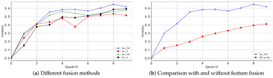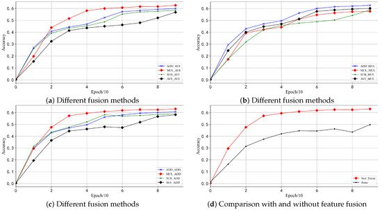 When designing the MD_CResDD network, both the fusion time and fusion method play crucial roles. For the fusion time, we use a combination of early fusion and late fusion. In terms of fusion methods, four approaches are compared in the experiments: Add, Subtract, Multiply, and Average. The control variables method is utilized to ensure accurate and effective experiments. Figure 4 illustrates the accuracy of the model across 100 epochs on the CW dataset, employing various fusion methods. Figure 4a–c illustrate the training process of the models with different fusion methods, while Figure 4d demonstrates a comparison between models with and without feature fusion.