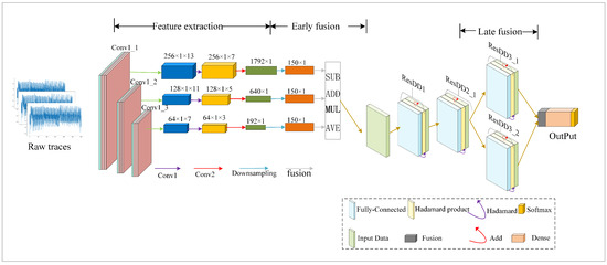 The initial phase of the MD_CResDD network, as described before, entails extracting features at multiple scales from the input data using convolutional kernels of varying sizes. These features, obtained at different scales, are then fused through an early fusion layer. Subsequently, the fused features are passed to the ResDD network layer, where further fusion operations occur in the final layer of the ResDD module. The structure of the MD_CResDD network built in this paper is as shown in Figure 7. The MD_CResDD model introduces feature fusion and network fusion mechanisms in contrast to typical DLSCA models. The feature fusion mechanism enhances information representation and fortifies the model’s robustness, while the network fusion mechanism mitigates the risk of model overfitting. Moreover, building on the ResDD model’s strengths, the MD_CResDD model is adept at quicker learning.