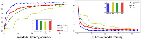 Table 3 shows that the MD_CResDD network performed better in terms of test accuracy, reaching 0.651 with low model loss, while the model reached its highest accuracy after only 270 epochs of training. Also, the model improved the fitting speed by 45.4% over the best-performing models in CNN, MLP, and DD.