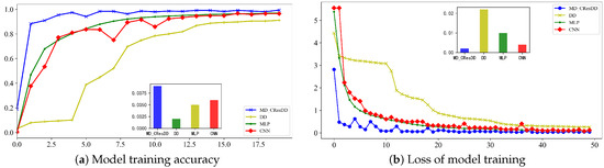 Figure 10 represents the test accuracy and the loss of the model after 500 rounds of training on the CW dataset, respectively. It can be seen that the multidimensional deep learning network MD_CResDD proposed in this paper has a faster fitting speed and higher accuracy compared with the other three models.