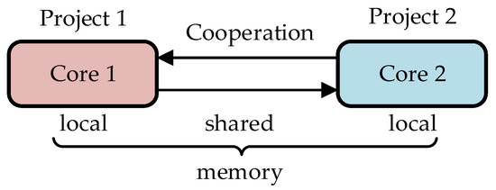 The dual-core PLC being developed may be viewed as equivalent to two separate PLCs with some communication link. Here, the link is provided by the shared memory. Figure 1 shows the general architecture, where Projects 1, 2 represent software of the PLC cores. It is assumed that each of them can also operate independently using its own local memory.