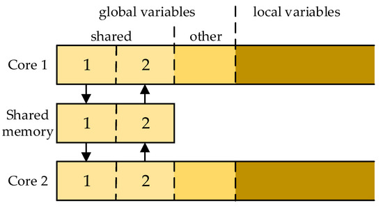 It seems quite probable in industrial practice that the variables from the sets GV1, GV2 will not be declared one after another, but will be scattered among other global variables. Transfer of such scattered variables to/from the shared memory would have to be performed individually, one by one. To make the transfer more time-efficient, the scattered GV1, GV2 variables may be collected into compact memory sectors transferred by fast memory copying. An extension of the single-core compiler for the dual-core application is needed to make such an ordered arrangement. The recommended memory organization after the arrangement is shown in Figure 3.