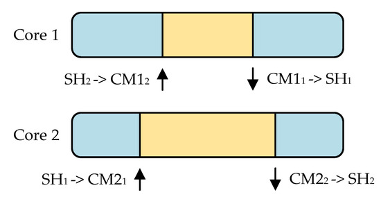 In case of Core 1, the content of CM12 memory becomes the input (see Figure 3). However, so far, it is stored in SH2, where it has been copied earlier from CM22, once Core 2 finished its execution. Hence, at the beginning of the Core 1 cycle, SH2 must be copied into CM12. At the end of the execution, the results updated in CM11 are copied into SH1. So, the beginning of execution and the end of the cycles of two cooperating cores may be illustrated as in Figure 4. To implement such behavior, the original single-core runtime must be extended by the copy-from the shared memory at the beginning of the cycle and copy-to at the end. Note that operations executed at the beginning may be called precycle, whereas those executed at the end may be called postcycle.