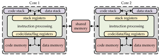 CPDev (control program developer) is a VM-based engineering environment used here for a dual-core upgrade. The environment consists of IL/ST/LD/FBD/SFC editors, a compiler that converts source programs into a VMASM (VM assembler) intermediate language, and a VM runtime written in C/C++ [38]. Details on the compiler, VM architecture, and characteristic of VMASM can be found in [39], with examples of controllers for the ship automation and energy sector. The simplified architecture of the VM is shown in Figure 5 for each of the two cores. The instruction processing module fetches successive VMASM instructions from the core memory and executes them, acquiring values from the data or code memories. Results are stored directly in the data memory.