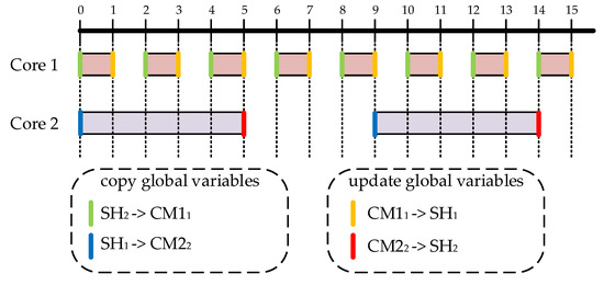 An exemplary synchronization of two projects is shown in Figure 7, also indicating transfers from/to the shared memory with notation from Figure 4. The first core runs a fast logic control every two time units, with the actual execution time taking one time unit. The second core executes a continuous control every nine units, whereas the execution takes five units.