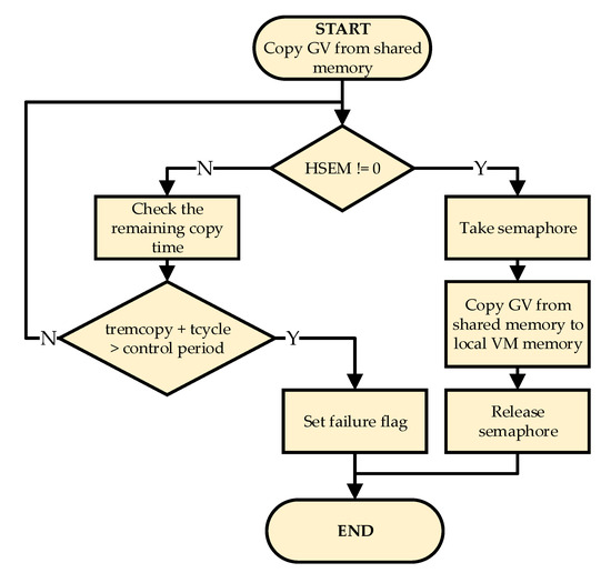 To protect the shared memory from reading and writing conflicts, the STM32 chip is provided with a classic semaphore called HSEM (actually 32 instances of the semaphore are available; HSEM corresponds to SH_SEM in the previous section). The algorithm shown in Figure 8 permits it to copy data from the shared memory only when the HSEM semaphore is released. The tremcopy in the algorithm denotes the time remaining for copying and the tcycle elapsed execution time of the program. If HSEM = 0 (semaphore down) and the sum tremcopy + tcycle does not exceed the control period, the algorithm remains in the precycle phase, trying to access the shared memory again. When HSEM = 1 (up) the algorithm proceeds to copy the shared sector involving the relevant global variables. If the sum tremcopy + tcycle exceeds the control period, the system will end the precycle phase and start executing the control program, signaling the failure in the flag register. This safeguard is required for correct cyclical operation in accordance with the IEC 61131-3 standard.
