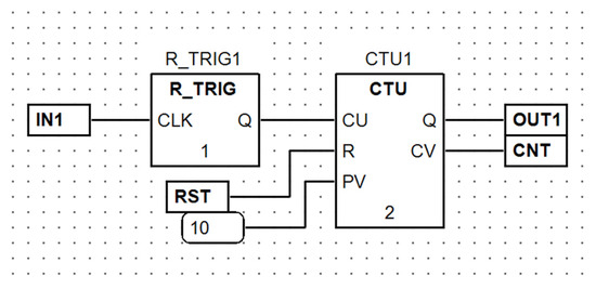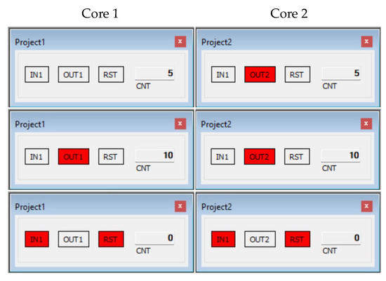 The operation of the cores is demonstrated in Figure 11 on the display panels of the IDE monitoring tool. The first row indicates an exemplary state after processing five pulses at IN1. Since CNT exceeds three, OUT2 in Core 2 is set (red). The second row represents the state after 10 pulses, so the output OUT1 becomes TRUE (red). The last row indicates values while keeping IN1 set for more than 5 s. So RST is set to TRUE which resets the counter back to 0.