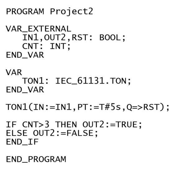 Cooperation of two projects is demonstrated here using a simple FBD diagram and ST code to count input pulses, monitor impulse time, and transfer signals between cores, as shown in Figure 9 and Figure 10. The FBD diagram is executed every 10 ms, and the ST code every 100 ms. All variables in the projects are global.