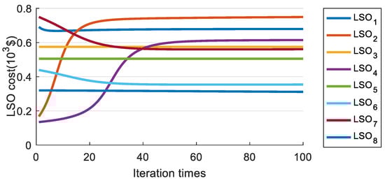 The example simulation was carried out on a certain day (24 h) to verify the effectiveness of the optimization model proposed in this study within a long time scale when . In this scenario, the total load demand curve of electricity, heating, and cooling on that day is shown in Figure A2 in Appendix A. The energy demand shown in Figure A2 was randomly assigned to eight LSOs, and the simulation was repeated 100 times. The subsequent conclusions are the average of the sum of these experimental results. In addition, the external electricity price is shown in Table A2 in Appendix A.