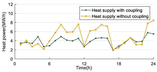 The influence of multienergy coupling on the total load reduction can be analyzed by solving the optimization model. Figure 4 shows that compared with the heat supply in the case without considering the coupling, the heat supply in the case considering coupling significantly decreases. The analysis shows that one part of the electric power is converted into heat, and traditional thermal equipment such as boilers can meet users’ heating power demand in the case of a low power output. Thus, the IDR based on a multienergy coupling proposed in this study can achieve low-carbon goals and provide a possibility for accessing clean energy to some extent.