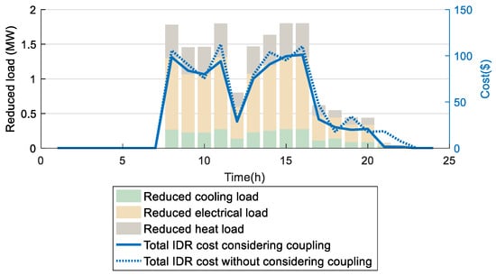 The cooling, heating, and power loads reduced by the IDR in 1 day are shown in Figure 5. The cost curve of this method was compared with the cost curve of using the power demand response in the absence of a cooling–heating coupling. During the daytime (8:00–16:00), many cooling, heating, and power load values must be reduced, and the corresponding two cost curves have high values. However, problems, such as network congestion and energy waste, were avoided because of the multienergy coupling. Thus, the curve that considers coupling is lower than the curve that does not consider coupling. The coupling model established in this study was advantageous in terms of the demand response cost (the total cost was reduced by 9%).