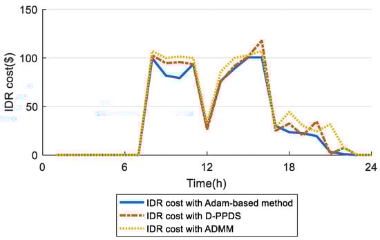 ADMM, D-PPDS, and the Adam-based method all use the gradient descent method (or dual ascent method) to obtain a global solution, and they all need many iterations. The difference is that ADMM and D-PPDS rely on topology and healthy distributed communication networks, and the data transmitted between units are multiple auxiliary variables that change with iterations. However, the Adam-based method uses centralized communication, and the data transmitted between units and servers contain gradient information. The curves shown in Figure 6 are the values of the three algorithms under the same model (Scenario II). Although the curves corresponding to the different methods are almost the same, the Adam-based method has a lower response cost and smoother curves than D-PPDS at times because of its historical characteristics and second-order momentum characteristics. Thus, the unnecessary switching actions and the unit start–stop in the dispatching plan can be avoided.