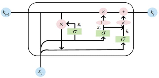 To solve the problems of ineffective long-term memory information transfer and gradient vanishing in backpropagation, a new recurrent neural network GRU, which is very similar to the Long Short-Term Memory (LSTM) neural network, has been widely used [41]. GRU can efficiently capture the semantic associations between long sequences, thus mitigating the problems of gradient vanishing and gradient explosion. However, the structure and computation of GRU are both simpler than those of LSTM. GRU mainly consists of two gate structure units: the update gate and the reset gate, as demonstrated in Figure 1.