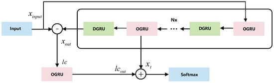 Finally, the loss compensation data, , are obtained through OGRU representation learning; then, plus are assigned to , and the final result is obtained after a Softmax activation function with the following formula: