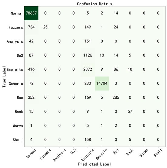 The UNSW-NB15 dataset was created by the Australian Centre for Cyber Security (ACCS) lab in 2015 [43]. The UNSW-NB15 dataset comprises both real normal traffic data and malicious attack traffic data. Meanwhile, the UNSW-NB15 dataset encompasses normal traffic data and nine types of attack traffic data. The nine types of attack traffic data are backdoor, penetration analysis, denial of service (Dos) attack, vulnerability exploitation, fuzz test, generalized attack, stomp, shellcode, and worm. Generally, the UNSW-NB15 dataset consists of 2,540,044 data samples classified into 10 types, as follows: