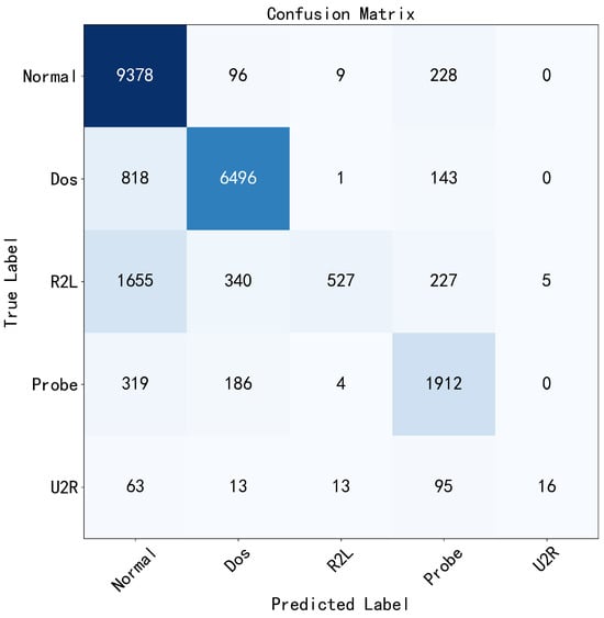The NSL-KDD dataset contains as a training set for model learning, and and as testing sets for the performance evaluations of the trained models [45]. Among them, has 125,973 traffic samples, has 22,544 traffic samples, and has 11,850 samples. Moreover, to simulate the realism of network traffic, the testing dataset includes many attacks that do not appear in the training set. Therefore, except for the 22 attack types in the training set, there are 17 different attack types in the testing set. To better train the model, is mainly used as the training set and as the testing set in the experiments.