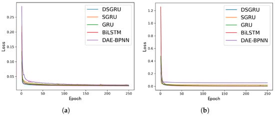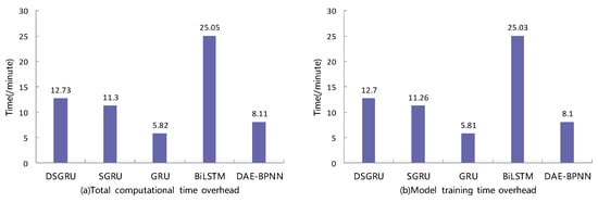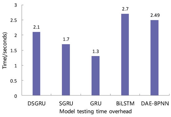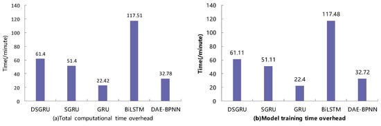 To compute the time complexity of DSGRU, the time complexity of GRU is analyzed first. According to Formulas (1)–(4) in Section 2, GRU requires maintaining three sets of parameters: the input gate, the forgetting gate, and the candidate state. Therefore, the total computational time overhead of GRU is . That is, the computational complexity of GRU can be denoted as . LSTM then requires maintaining four sets of parameters: the input gate, the oblivion gate, the output gate, and the candidate state. Therefore, the total computational time overhead of BiLSTM is . That is, the computational complexity of BiLSTM is denoted as . Meanwhile, the total computational time overhead of DSGRU is , where d is the number of layers of OGRU and DGRU. As a consequence, the computational complexity of DSGRU and GRU are the same and both are . Moreover, since both DAE and BPNN contain two-layer–fully connected layer structures in our reproduction experiments, the total computational time overhead is , and the computational complexity can be denoted as .