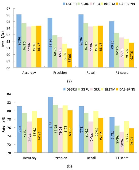 Figure 7a demonstrates the effectiveness of the comparison results based on the UNSW-NB15 dataset. We can obviously see that, compared with the other four previous intrusion detection schemes, our proposed scheme performs best in accuracy, precision, recall, and . For example, the accuracy of our proposed scheme reaches , which is , , , and higher than those of the SGRU-based intrusion detection scheme [40], GRU-based intrusion detection scheme [41], BiLSTM-based intrusion detection scheme [37], and DAE-BPNN-based intrusion detection scheme [39], respectively. For another example, the precision of our DSGRU-based intrusion detection scheme reaches . However, the precision of the SGRU-based intrusion detection scheme [40] is , the precision of the GRU-based intrusion detection scheme [41] is , the precision of the BiLSTM-based intrusion detection scheme [37] is , and the precision of the DAE-BPNN-based intrusion detection scheme [39] is . Meanwhile, the other two metrics (i.e., recall and ) of our proposed scheme are both better than those of the other four solutions.