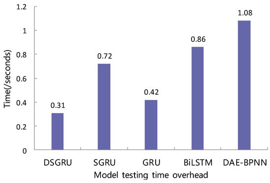 To evaluate the real-time intrusion detection, we measure the model testing time overhead, as demonstrated in (Figure 9). From Figure 9, we can see that the BiLSTM-based intrusion detection scheme [37] requires the most model testing time overhead, followed by the DAE-BPNN-based intrusion detection scheme [39] and our proposed DSGRU-based intrusion detection scheme. The GRU-based intrusion detection scheme [41] requires the least model testing time overhead. However, the difference in model testing time overhead is small. For example, our proposed scheme requires s to achieve model testing, while the model testing time overhead of the GRU-based intrusion detection scheme [41] is s. In other words, the difference in model testing time overhead is so small that it is acceptable. Therefore, we can consider our proposed DSGRU-based intrusion detection scheme to be quite efficient.