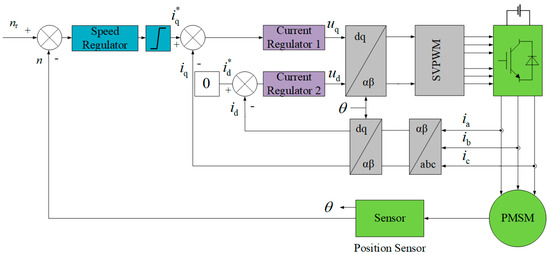 The block diagram of a PMSM speed-control system is shown in Figure 1, which uses a surface-mounted PMSM. The PMSM speed-regulation system adopts vector control, in which the speed regulator and current regulator adopt PI control to form a double closed-loop structure. The system works as follows: The position information collected by the position sensor is calculated to obtain the actual speed of the PMSM. The difference between the given speed nr and the actual speed n is used as the input of the speed PI regulator. The currents id and iq of the dq axis are obtained by coordinate transformation of the collected three-phase currents ia, ib, and ic. Set id* to zero and subtract id as the input to the current regulator 2. The output of the speed PI regulator is iq* and its difference from iq is added to the current regulator 1. The outputs ud and uq of the two current regulators are converted by coordinates as inputs to the SVPWM generator to generate six drive signals that control the inverter to provide drive voltage to the PMSM. For such a closed-loop control system, when the speed fluctuates, the control signal will also change so that the speed is stable near the given value.