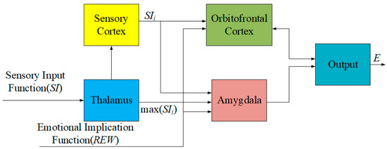 BELC simulates human brain behavior in the process of emotional learning and processes input signals to generate output control signals. The BELC model architecture is shown in Figure 2. The amygdala, sensory cortex, orbitofrontal cortex, and thalamus constitute the BELC. The thalamus receives SI, stimulates the sensory cortex, and regulates the amygdala and orbitofrontal cortex. The amygdala and orbitofrontal cortex learn through REW. The output of the controller E is the amygdala–orbitofrontal cortex difference. The orbitofrontal cortex monitors the amygdala BELC learning process to prevent errors.