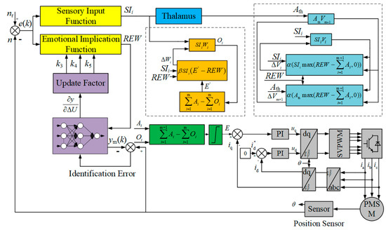 In the PMSM system, the difference between the given speed and the feedback speed is fed into the brain emotional learning control. Set the speed of the PMSM speed-regulating system as nr, the feedback speed as n, and the input error of brain emotional learning control as e = nr − n.