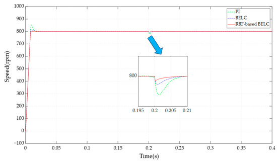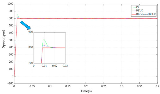 The simulation time was set at 0.4 s and the speed was set at 800 rpm under no-load condition. The no-load speed waveforms under the RBF-based BELC, BELC, and PI control are illustrated in Figure 4.