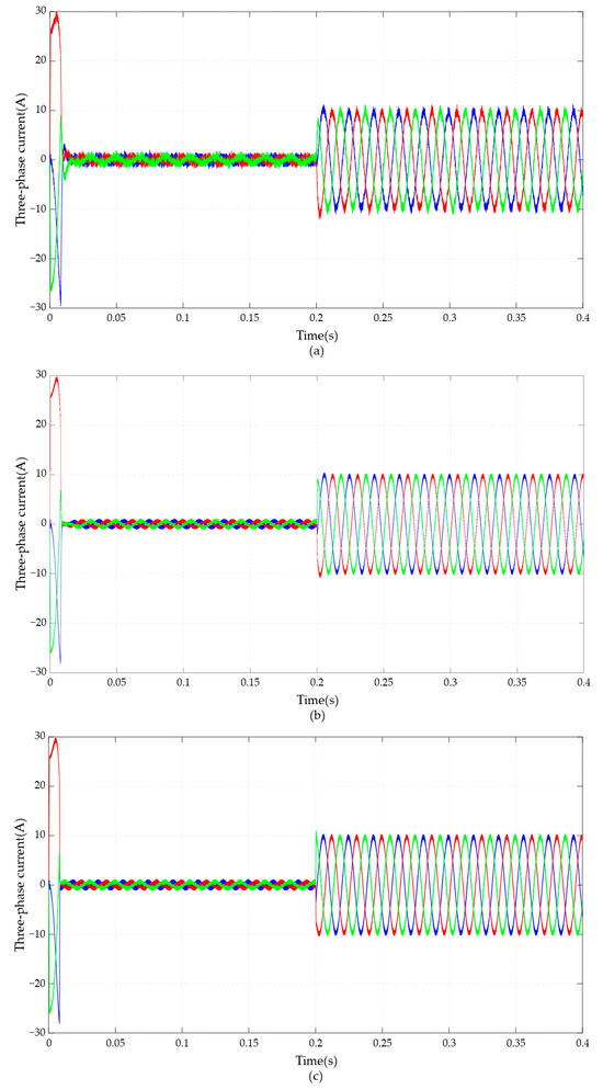 The current waveforms are shown in Figure 6. Figure 6a–c respectively correspond to the three-phase current waveforms under PI, BELC, and RBF-based BELC.