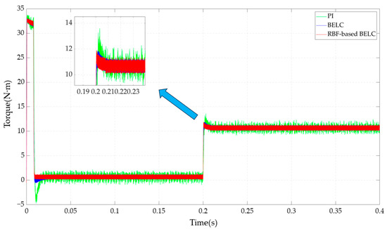Figure 12 shows the torque waveforms of the three control strategies under sudden loading. Figure 11a–c show torque waveforms for PI, BELC, and RBF-based BELC. The torque of the PMSM began to rise after adding a sudden load.