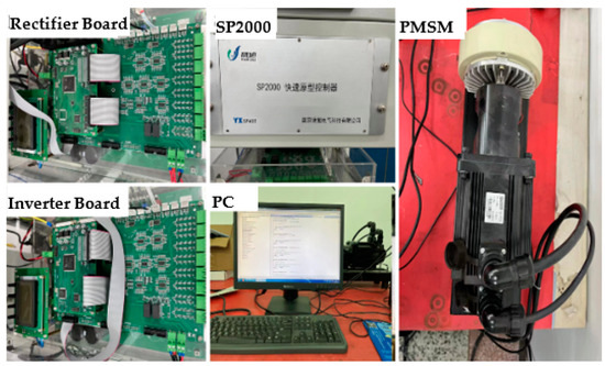 As seen in Figure 8, an experimental platform for a PMSM speed-regulating system based on the RBF-based BELC was created to confirm the accuracy of the suggested control theory. This experiment was based on the SP2000 rapid prototype controller, which takes the DSP28335 as the control core, and combines MATLAB and Simulink automatic code-generation technology. In Simulink, a simulation model of a PMSM controlled by the RBF-based BELC was built, communication modules such as ADC and DAC were set up, and a C program to control the PMSM was automatically generated and downloaded to DSP. The PMSM parameters were the same as those shown in Table 1