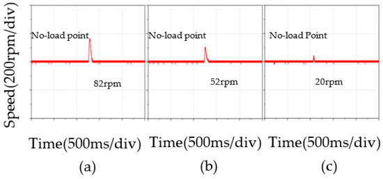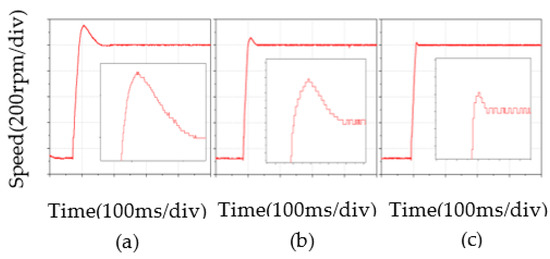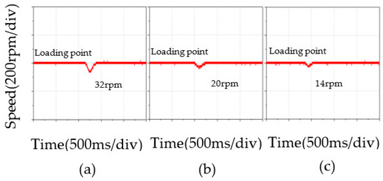 Figure 10 shows three speed waveforms controlled under sudden loading, in which (a), (b), and (c) are PI, BELC, and RBF-based BELC, respectively. According to the test results, under unexpected load changes, the speed controlled by PI dropped to about 32 rpm and it took the longest to recover to the specified speed. The speed was reduced by 20 rpm with the BELC and 14 rpm with the RBF-based BELC, and it took the shortest time to return to the specified speed. Compared with the three control methods, the speed regulation with the RBF-based BELC had a better control effect when the speed returned to the specified speed after a sudden load change.