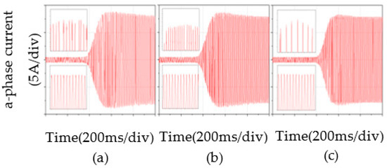 Figure 13 shows the experimental waveforms of current under the three control strategies, in which Figure 12a–c are a-phase waveforms of a PMSM under PI control, BELC, and RBF-based BELC.