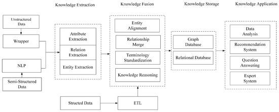 Google formally introduced the concept of knowledge graph [31] (KG) in 2012, aiming to realize a more intelligent search engine, and then KG began to be widely used in academia. Its core idea is to organize knowledge into a graphical structure, where nodes represent entities and edges define relationships between entities. This graphic structure makes the associations between knowledge intuitive and easy to understand. The construction of a knowledge graph typically involves several key steps, including knowledge extraction, knowledge fusion, knowledge storage, and other related processes [32]. The construction process is shown in Figure 1.