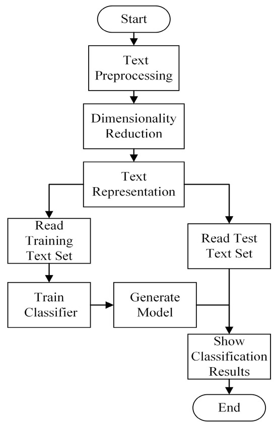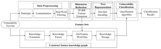 Vulnerability classification is the process of categorizing and labeling known vulnerability information according to a developed system or standard and then organizing the vulnerability information into one or more categories. This process is mainly completed automatically by computer. The detailed operation of vulnerability classification is illustrated in Figure 2. Initially, the vulnerability text undergoes preprocessing, after which the data is dimensionally reduced to obtain low-dimensional data for vector representation. The vector representation of the dataset is divided into a training set and a test set. The training set is input into the classifier for training to obtain the appropriate classifier parameters, and then the test set is input into the classifier to obtain the classification results.