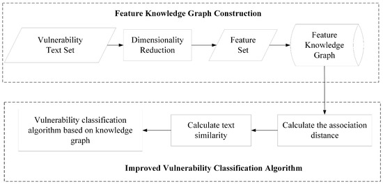 - Improvement in vulnerability classification algorithm: Calculate the association distance between feature words according to the feature knowledge graph and use its combination with the Euclidean distance to calculate the text similarity to realize the improvement in the vulnerability classification algorithm.