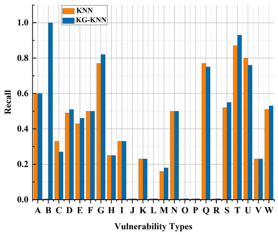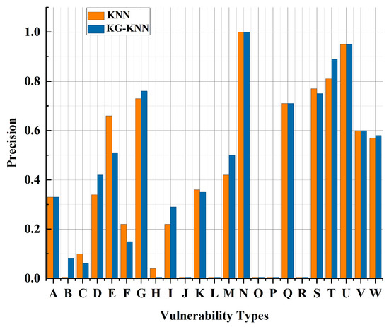 The category falls within a limited number of classes, as evident in Figure 7. This observation implies that KG-KNN has demonstrated an improved precision rate when classifying these select categories. We also vectorize the text and labels to obtain a vulnerability feature representation set. The dataset is divided into a training dataset and a test dataset according to 8:2 to observe the classification effect of KG-KNN and the original algorithm (KNN) under the same dataset. The test results are shown in Figure 8, Figure 9 and Figure 10, where yellow represents the KNN and blue represents the KG-KNN. A–W denotes the categories in the test set, which are, in order of priority, SQL injection, code injection, code issues, trust management issues, exposure of sensitive information to an unauthorized actor, critical management errors, command injection, security features, cryptographic problems, insufficient verification of data authenticity, improper authentication, missing encryption of sensitive data, improper access control, injections, improper privilege management, race condition, memory buffer errors, incorrect default permissions, resource management errors, cross-site scripting, cross-site request forgery, path traversal, and improper input validation.