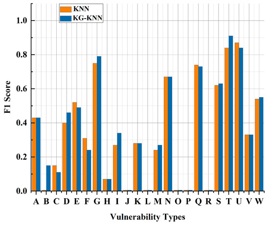 The comparison between KG-KNN and the original classification algorithm in terms of the F1 score is shown in Figure 10. KG-KNN shows significant improvements in handling very few categories such as code injection and cryptographic security issues. This means that KG-KNN achieves a better balance and improves the F1 score when classifying these important but relatively uncommon categories.